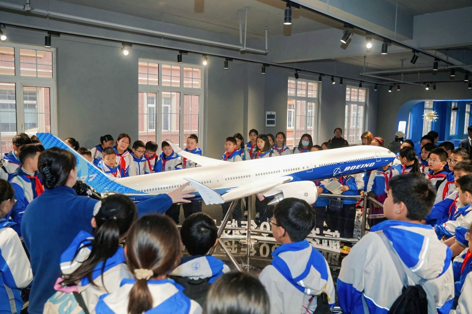 波音737-300实体飞机360°调查:同学们化身“航空工程师”,绕着真实客机细致观察,从机翼的弧线到机身的结构,初步读懂“飞机如何在蓝天翱翔”的原理。