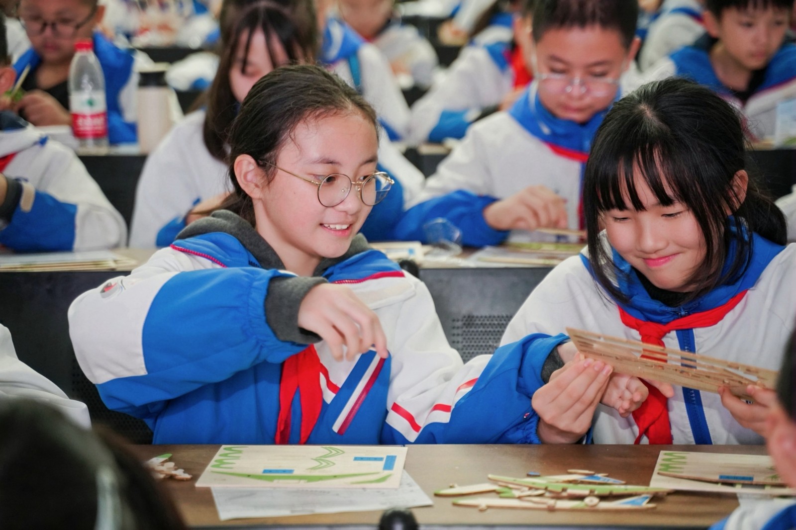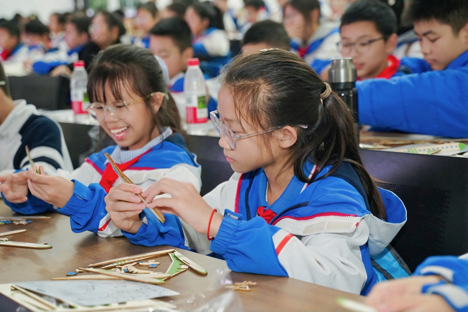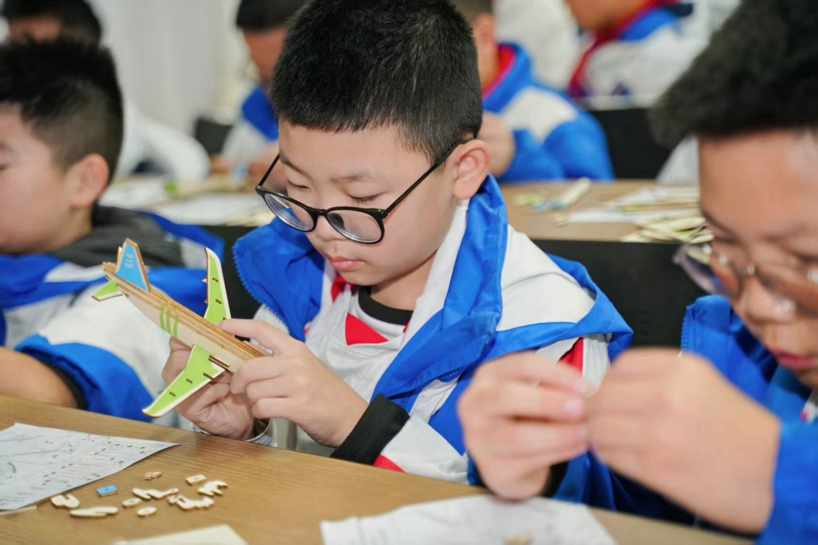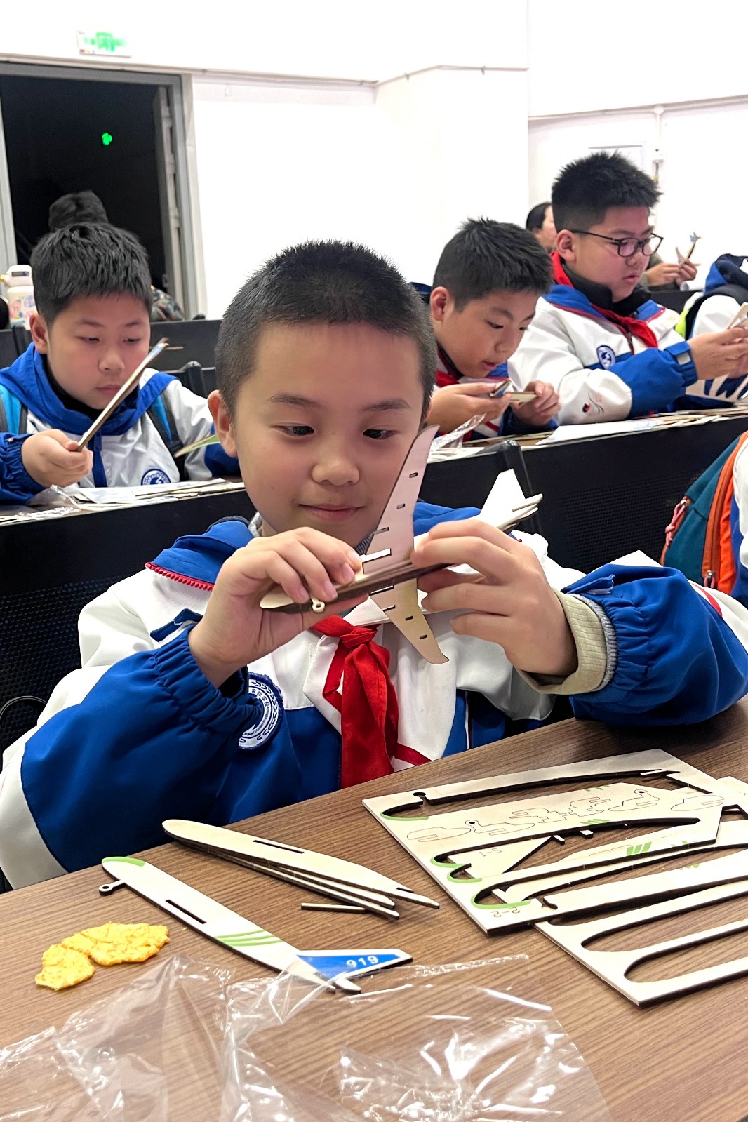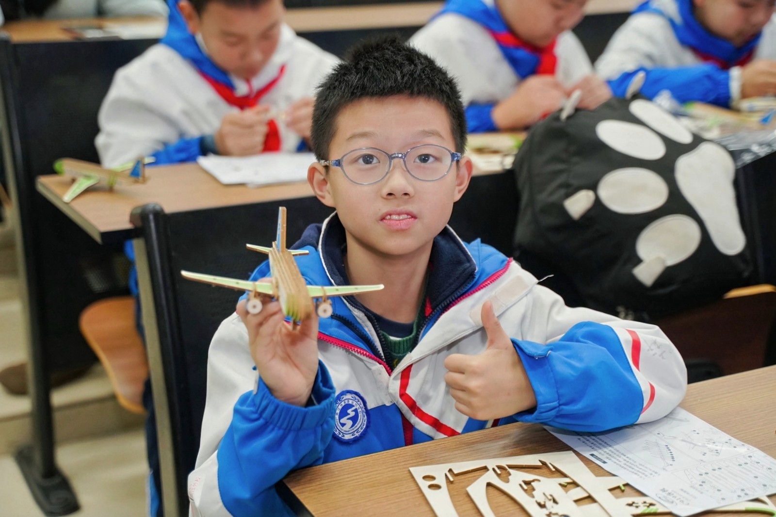 亲手设计、制作航模时,同学们把“飞机结构、动力来源”的知识融入实践。当自己的航模在手中成型,“原来飞行的原理可以这么有趣”的感叹声此起彼伏。
