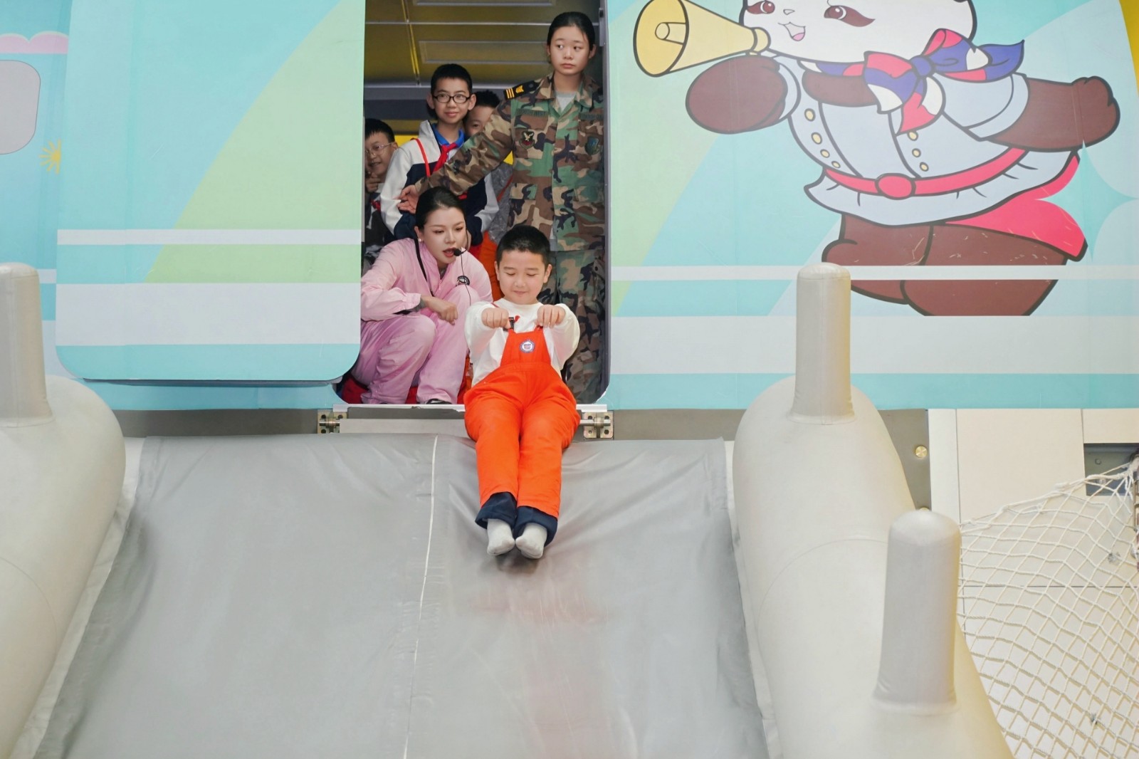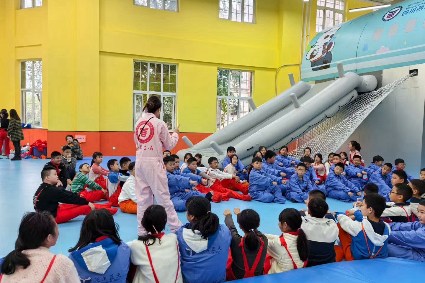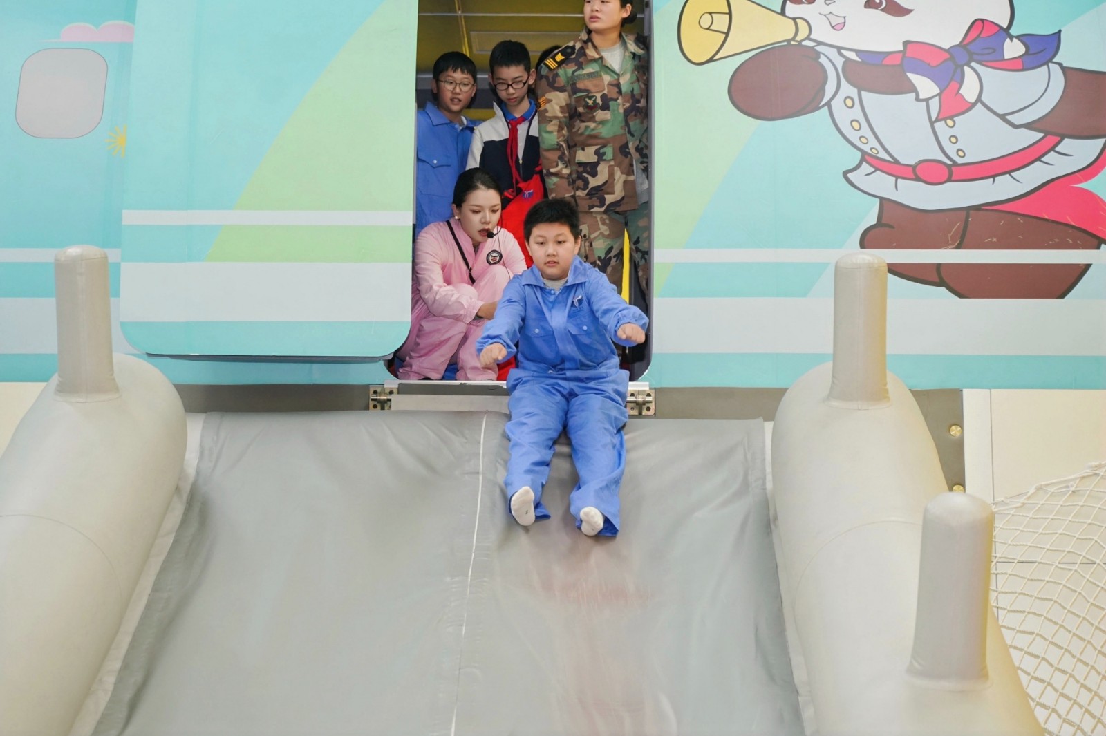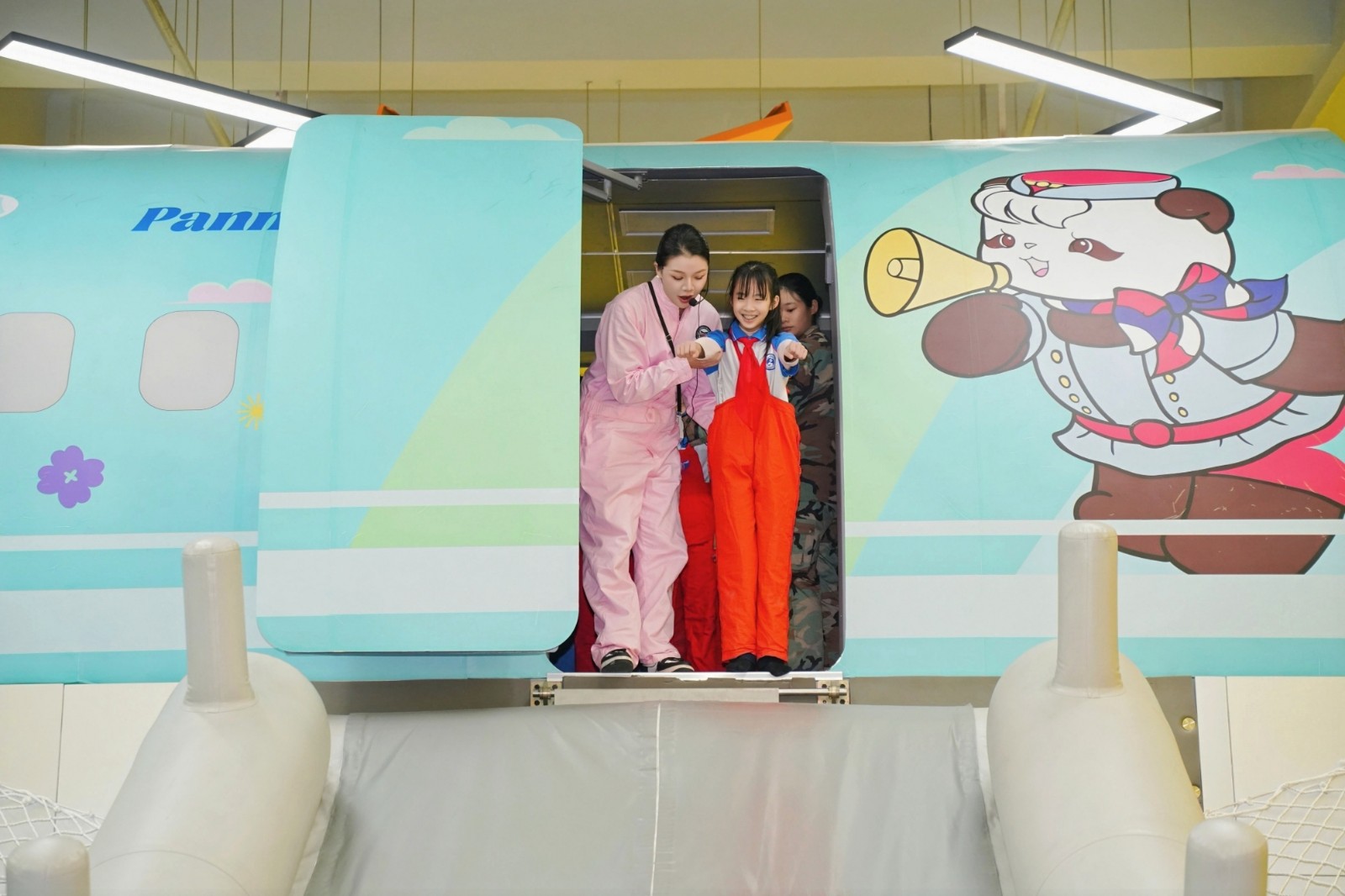 模拟“飞机紧急迫降”场景,同学们认真学习防撞击、逃生撤离技能,在紧张又刺激的演练中,掌握了关键时刻的“生存智慧”。
