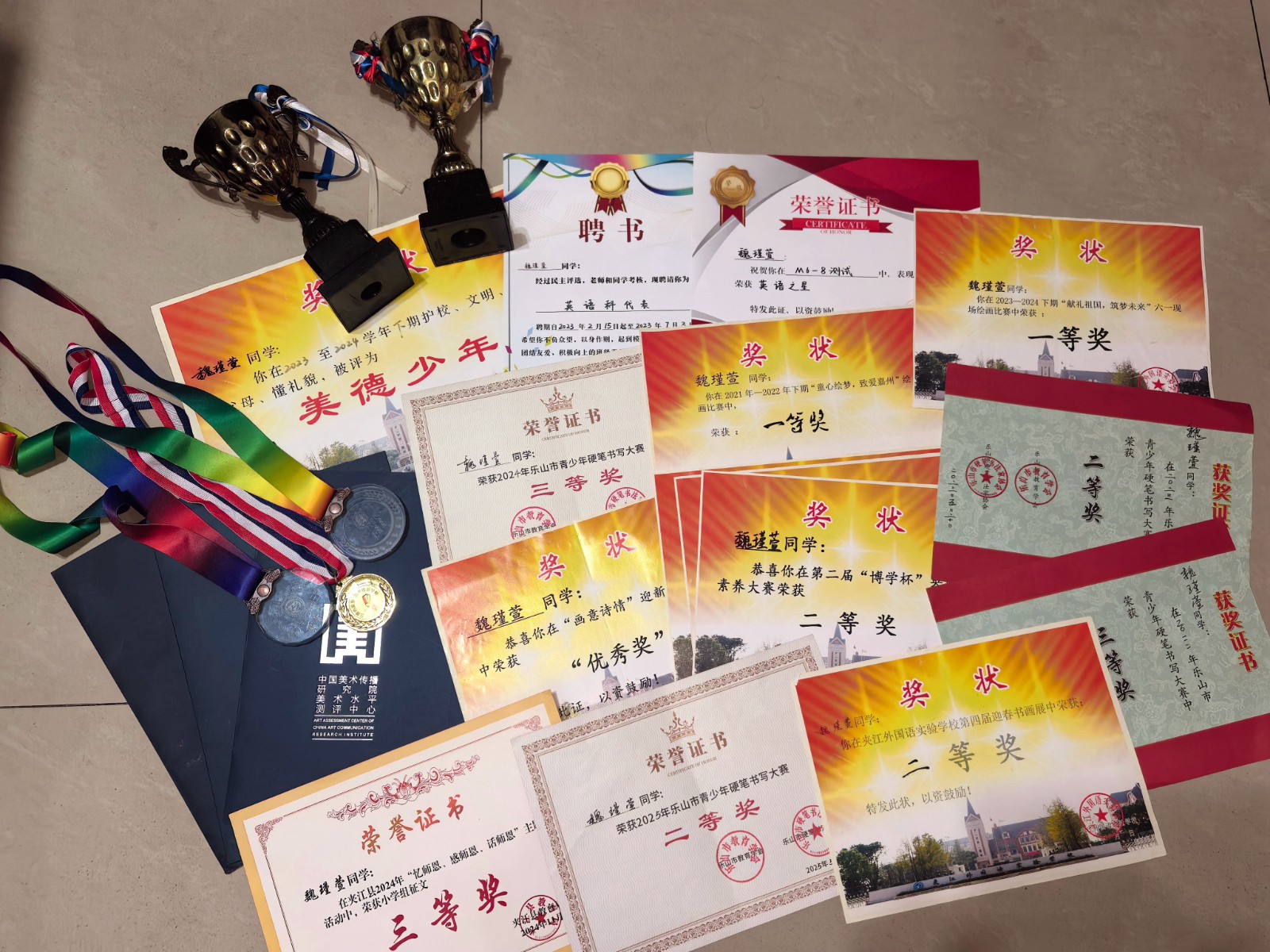 生活中,她更是一位兴趣广泛,多才多艺的少年。舞台上,无论是小主持人大赛的自信表达还是红领巾讲解员的生动解说,都藏着她对生活的态度。她多次在学校绘画比赛中荣获“一等奖”,作文比赛更是荣获夹江县“三等奖”。