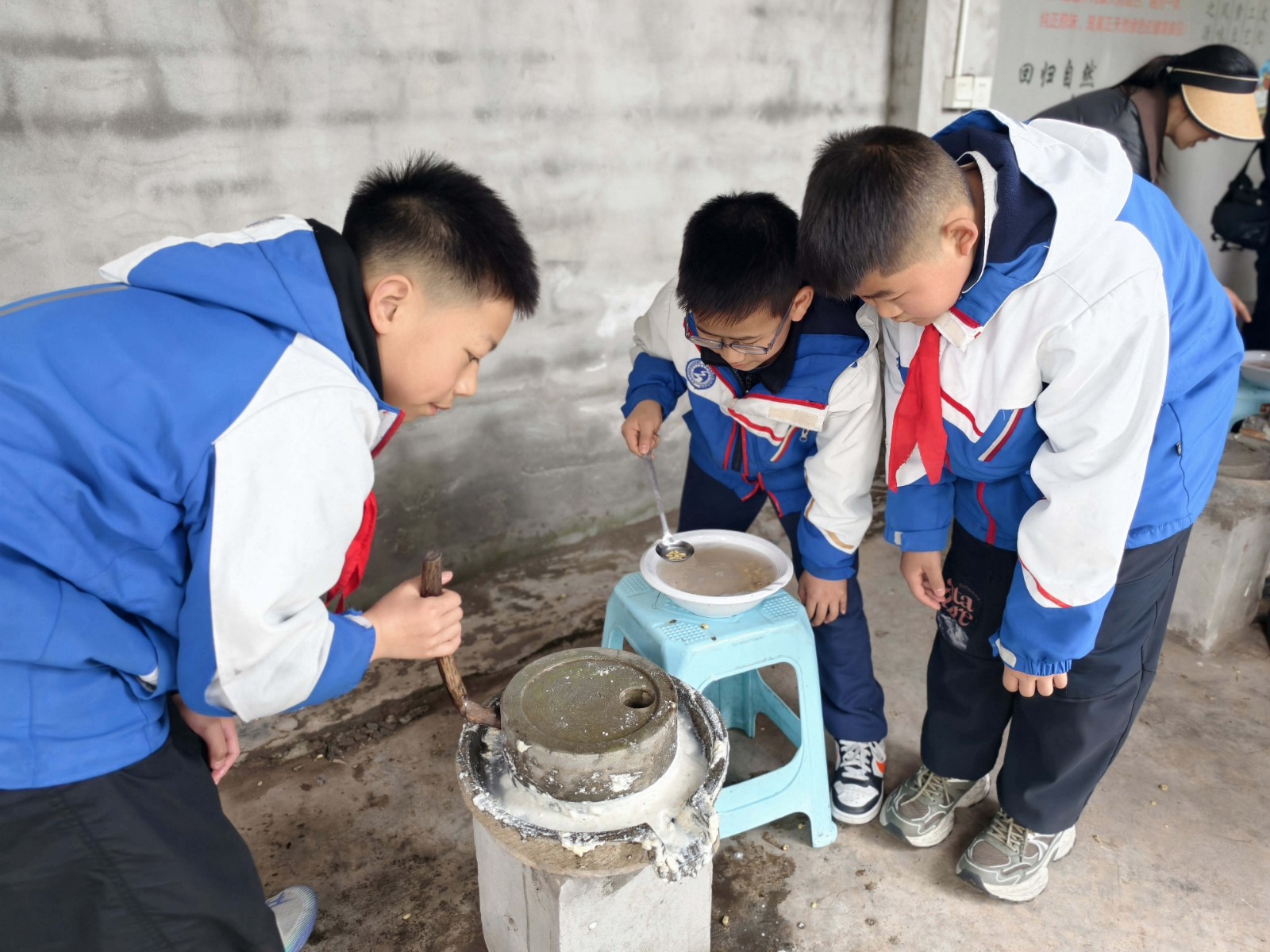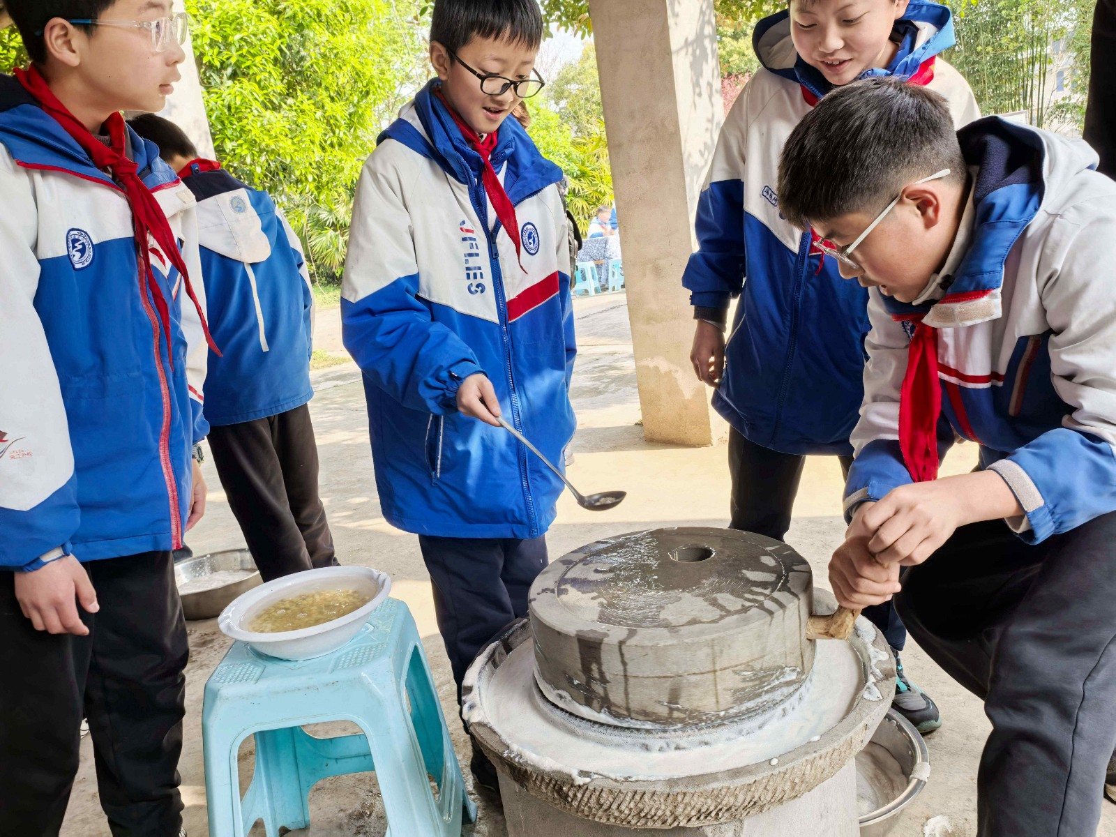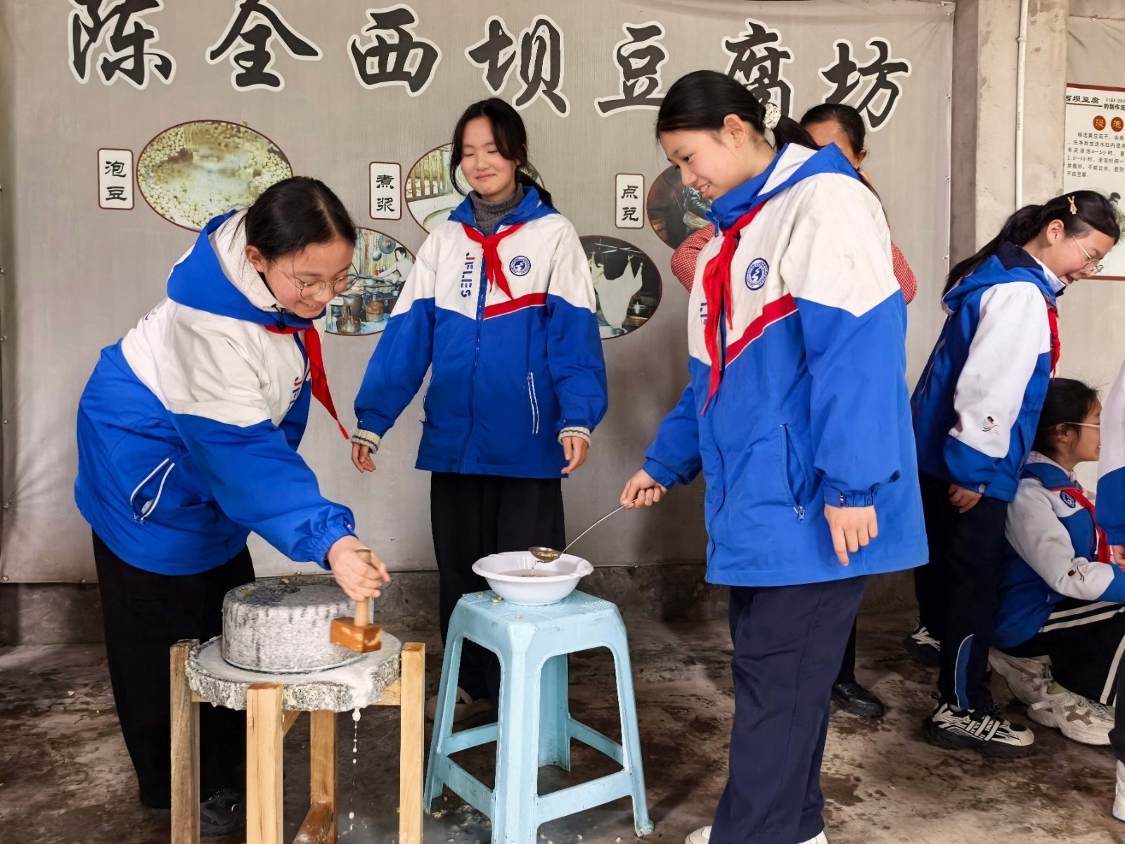 西坝豆腐作为省级非物质文化遗产,以选料考究、工艺精湛、风味独特闻名。活动现场,非遗传承人向同学们细致讲解西坝豆腐的历史渊源与制作要点,带领大家开启一场从黄豆到佳肴的奇妙旅程。同学们认真挑选优质黄豆,亲手推动石磨磨浆,体验磨豆子的传统工序,雪白的豆浆翻滚凝结,鲜嫩的豆花新鲜出炉,大家在欢声笑语中感受劳动与匠心的碰撞。