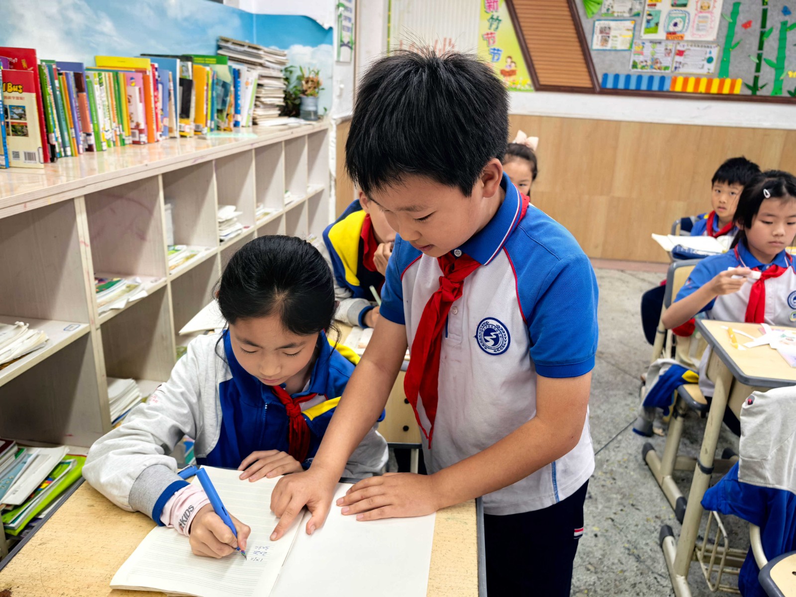 在学校里,见到老师,他会主动立正,鞠躬说:“老师好。”见到同学,他会主动打招呼。课间,他从不在走廊追逐打闹,而是靠右慢行,保持安静,不打扰其他班级的同学学习。看到地上有纸屑,他会主动捡起来扔进垃圾桶。看到同学有题目不会做,他会耐心地讲解自己的思路。他还积极参加班级的值日活动,把黑板擦得干干净净,把讲台整理得整整齐齐,让老师和同学有一个舒适的学习环境。